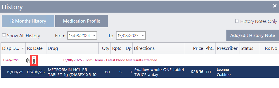 Patient History Notes display in bold red font in order to stand out more from other line items.