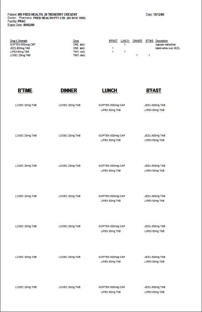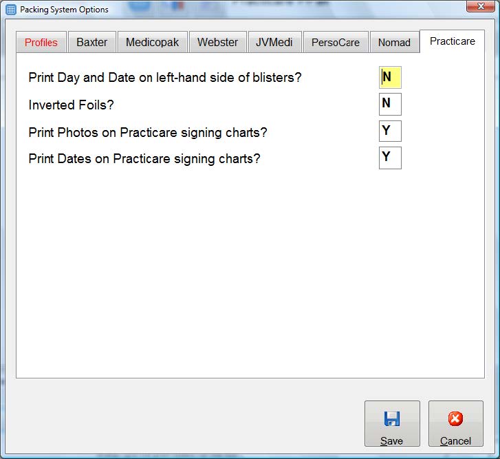 On the Practicare tab, enter N for Print Day and Date on left-hand side of blisters?