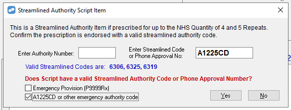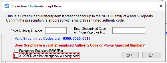 When dispensing items that require an emergency authority code, you will see the following prompt. The checkbox will contain the code that you configured above.
