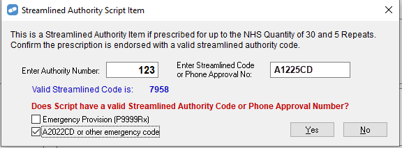 The 2 December Fred Dispense drug file has been updated with the expanded list. When dispensing eligible authority items, please remember to use 123 as the authority number and select the ‘A2022CD or other emergency code’ checkbox. In the Enter Streamlined Code or Phone Approval No: field, type A1225CD in place of any other code.
