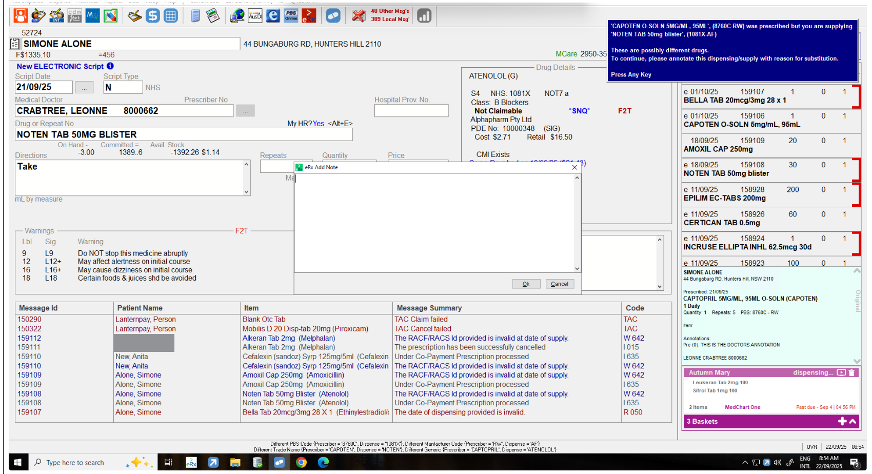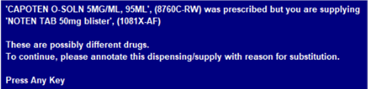 The system compares the medication selected for dispensing with the one prescribed using the identifiers provided in the electronic script infomation from eRX. If there’s a difference — such as a different PBS code or AMT(Australian Medicines Terminology) code— and Fred Dispense doesn’t consider them equivalent, a warning will appear.