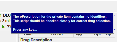 For private prescriptions, matching relies on AMT medicine identifiers rather than PBS codes, the following message will display if these identifiers are missing from the electronic script information that the prescriber has supplied.