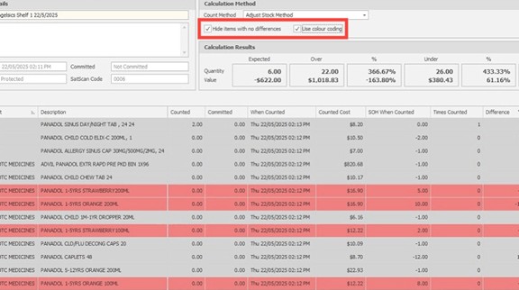 Once the stock had been counted you can use two additional features; Use Colour Coding or Hide items with no differences.
