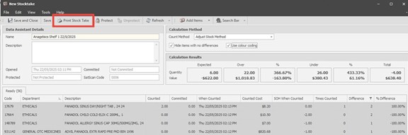 Once you have reviewed all discrepancies and entered the correct stock on hand in the Counted column, click Protect, then Calculate. The Data Assistant Stock Take Discrepancy window shows the final outcomes from the stock count, and provides a link to the Stock Take Details report.