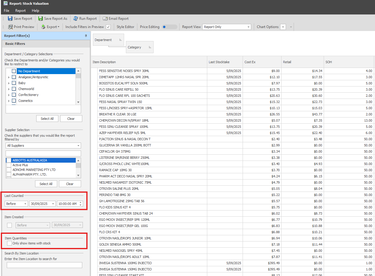 When performing regular batch stocktakes across your store, it is important to run a stock valuation report to capture any items you may have missed when counting, and to keep track of which sections have not been counted for some time.