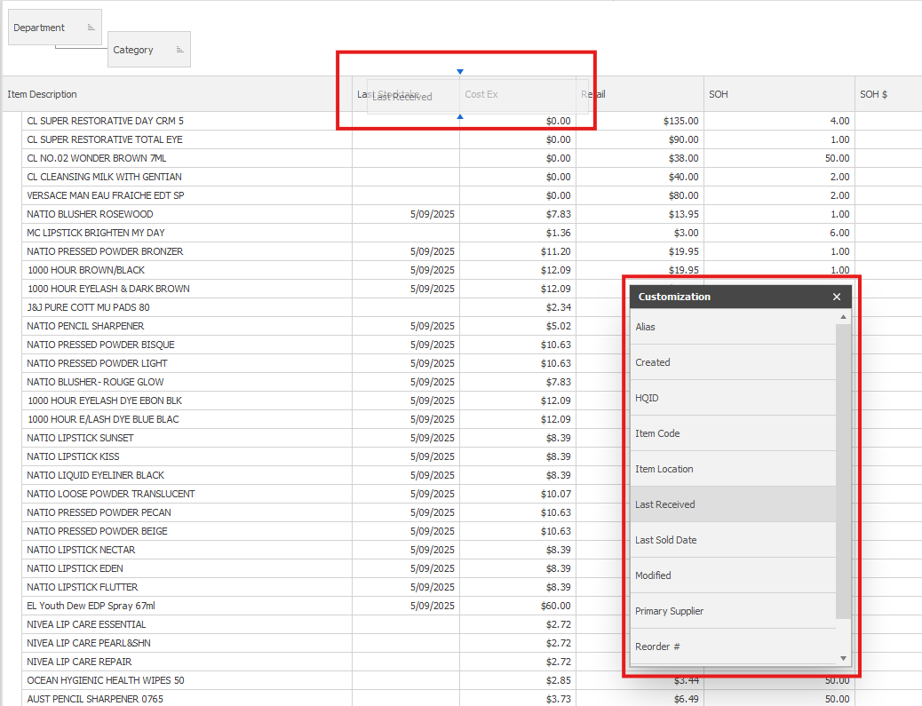 Complete this step to add Last Stocktake,Last Received and Last Sold Date columns. If the Last Stocktake Date column is blank for an item, this indicates that the item has never been counted.