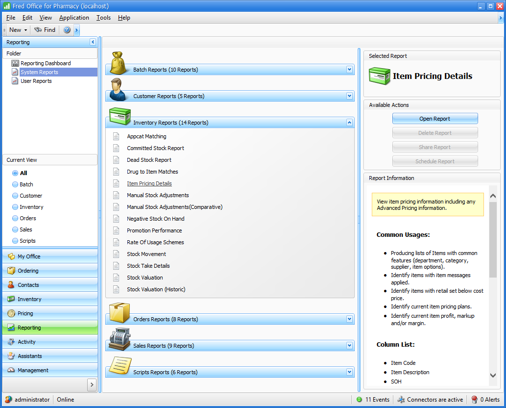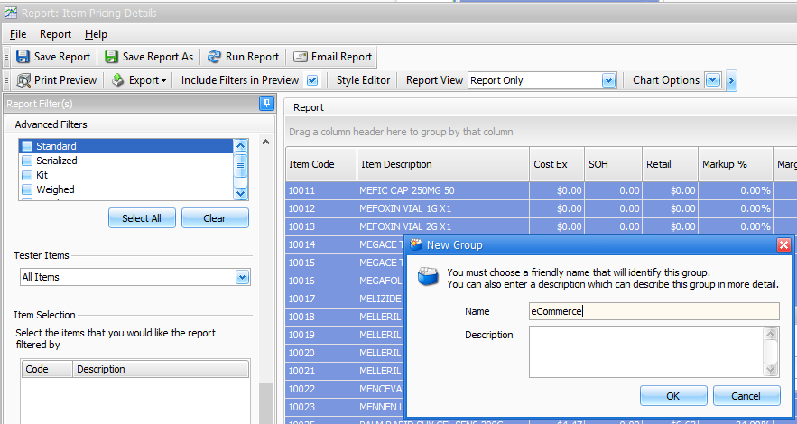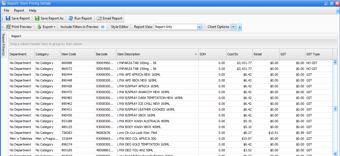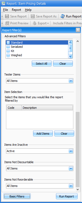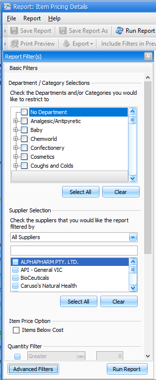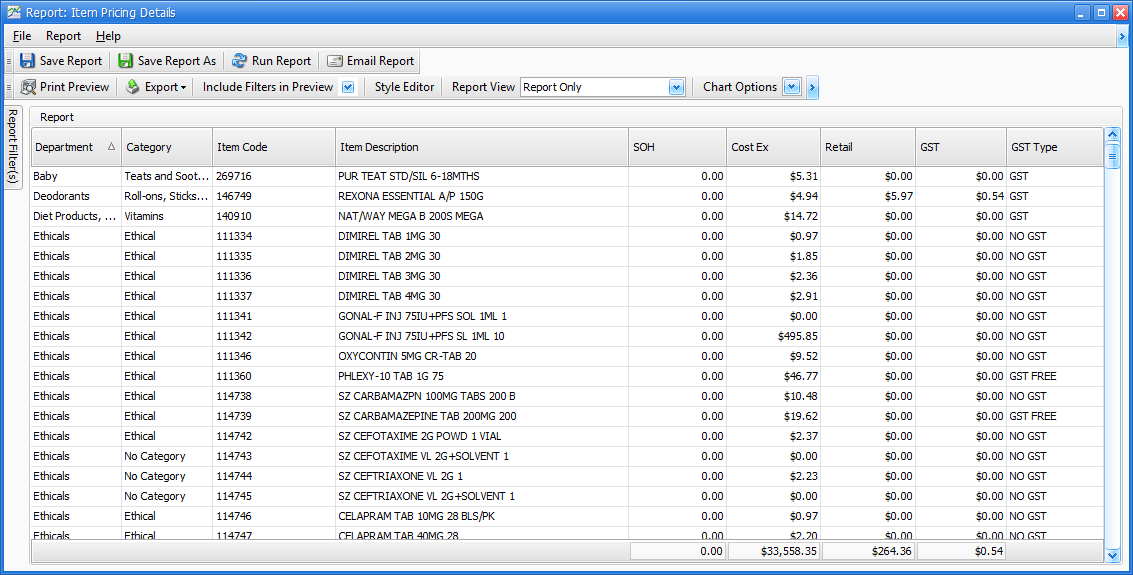 The item Pricing Details report can be used to export selected item details for Fred Office Plus.