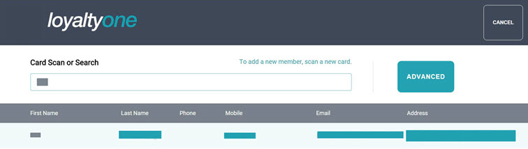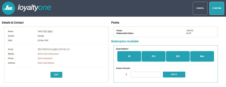 The LoyaltyOne app provides an in-POS connection to the LoyaltyOne portal and provides visual feedback related to POS member activities. The tile enables click through to the LoyaltyOne portal for member activities, including selection, updating, adding, point balance review and point redemption.