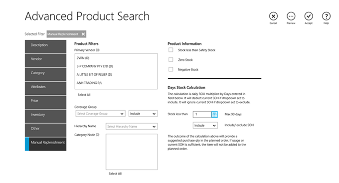 When creating ad hoc orders by vendor(s) within the Planned Orders screen, a new Manual Replenishment filter in the Advanced Product Search can be used to manually generate a suggested order.