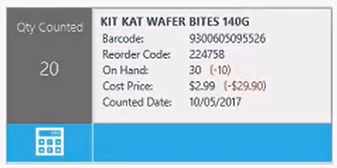Once products are counted and the batch is committed, the On Hand value is updated. Variance is displayed in red and records the difference between the On Hand value at the start of counting and the counted Qty.