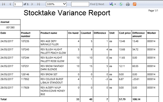 The Stocktake Variance report displays breakdown of all counted items in the journal, with the variance Qty and variance $ value.